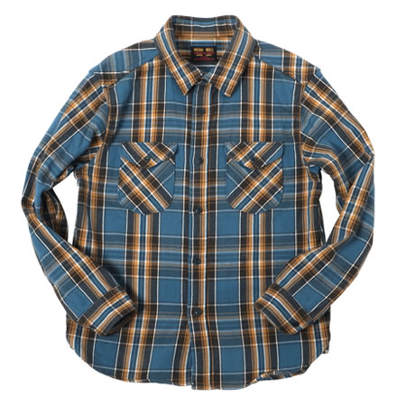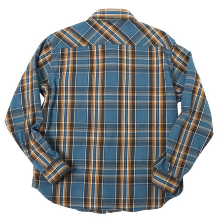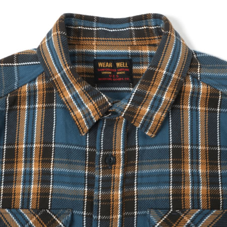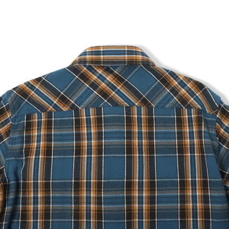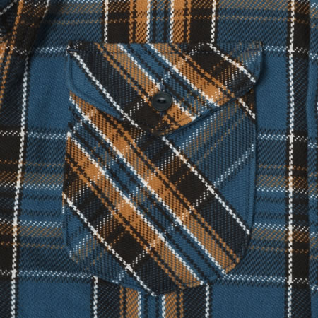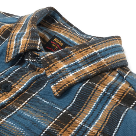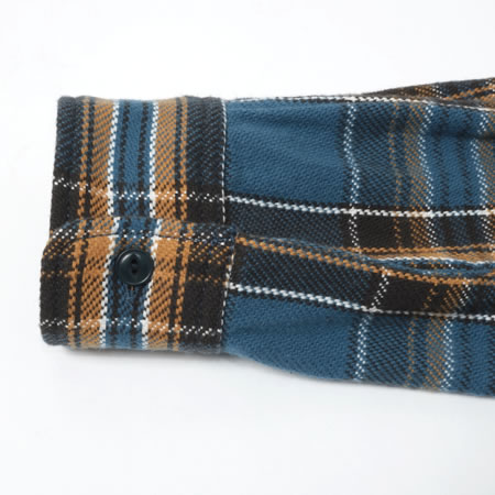 UESのヘビーネルシャツは、厚みのある生地と、力織機で織ることで表現される風合いが大きな特徴です。タテ糸とヨコ糸の打ち込みのバランスが良く、適度に生地が動くことで着心地が良くなります。生地の風合いを是非手にとって実感してください。直接染料を使用した先染めの生地は、着込むことで少しずつ褪色していきます。微妙な色のトーンが楽しんでいただけます。裏面に微起毛を施し、やわらかな肌触りと同時に、保温性も高めています。チェックの配色は白のラインが濃淡のメリハリを生み出しています。また、タテ糸の色の組み合わせは、微妙に色を変え多色使いすることで、ベーシックな中にも現代的な雰囲気を感じていただけるよう工夫しています。