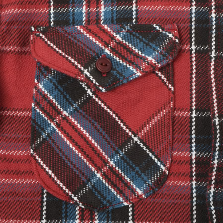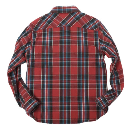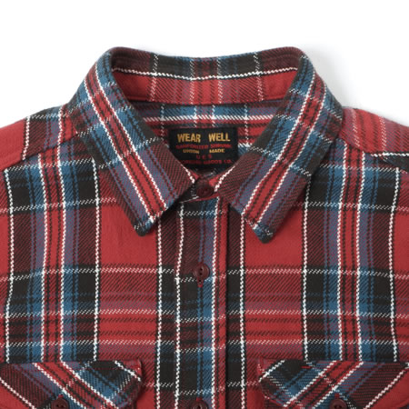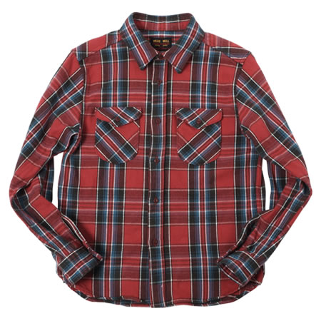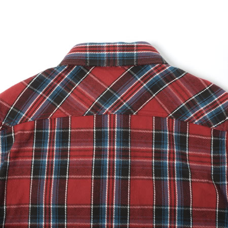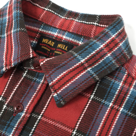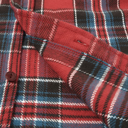 UESのヘビーネルシャツは、厚みのある生地と、力織機で織ることで表現される風合いが大きな特徴です。タテ糸とヨコ糸の打ち込みのバランスが良く、適度に生地が動くことで着心地が良くなります。生地の風合いを是非手にとって実感してください。直接染料を使用した先染めの生地は、着込むことで少しずつ褪色していきます。微妙な色のトーンが楽しんでいただけます。裏面に微起毛を施し、やわらかな肌触りと同時に、保温性も高めています。チェックの配色は白のラインが濃淡のメリハリを生み出しています。また、タテ糸の色の組み合わせは、微妙に色を変え多色使いすることで、ベーシックな中にも現代的な雰囲気を感じていただけるよう工夫しています。