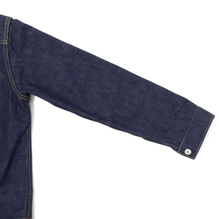 袖を1枚袖にすることで ワークテイストの武骨なシルエットを表現しました。今までリリースした3型のデニムジャケットと比較しても一番身幅が広く、14.9オンスのデニムをストレスなく着用して頂く為のリラックスシルエットです。