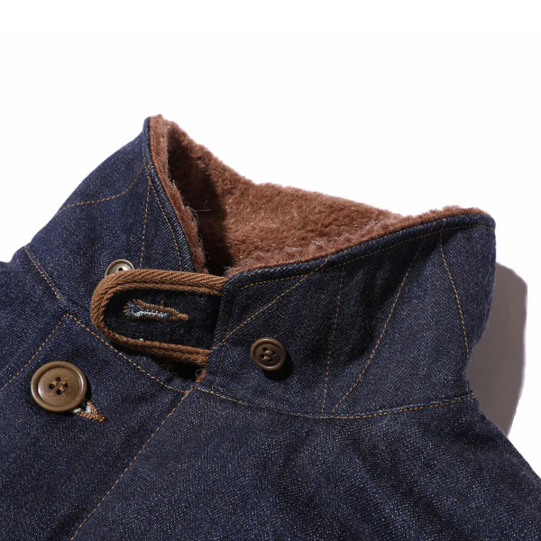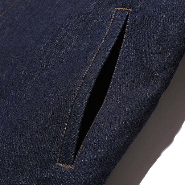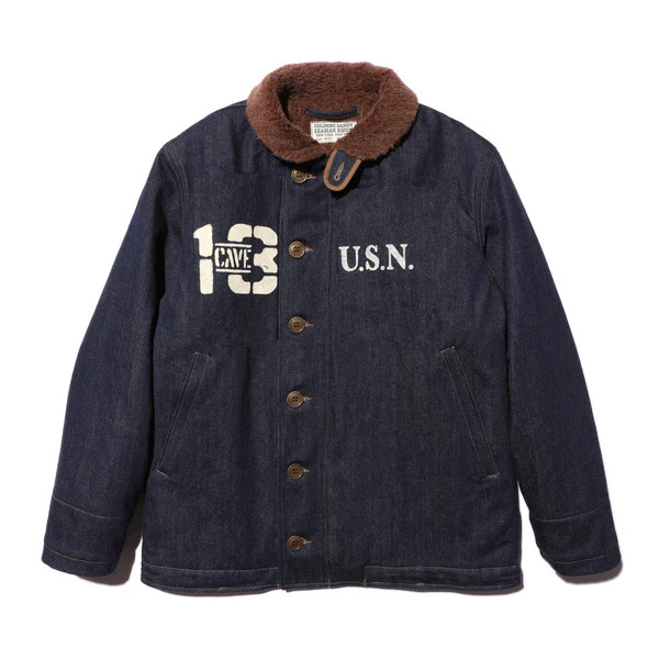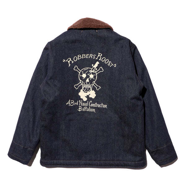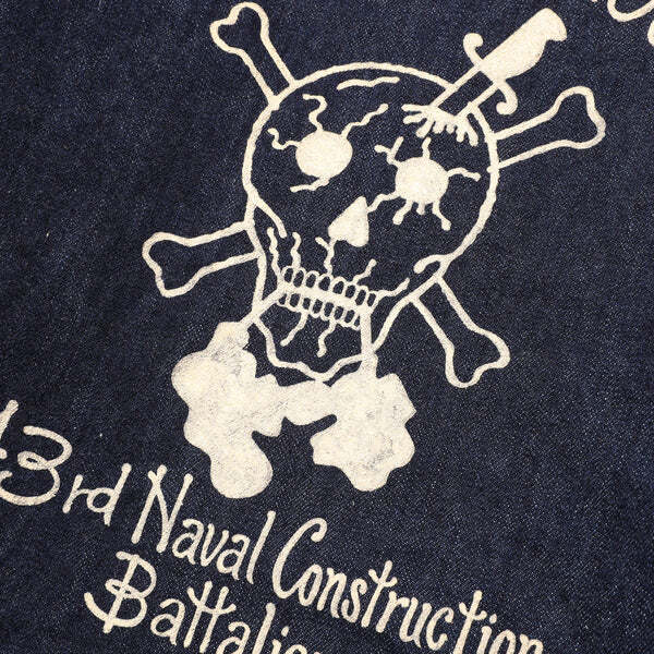 OBSERVER JKT INDIGO LTDのカスタムモデルをご用意しました。インディゴカラーに映えるよう、白のステンシルで製作。カスタムテーマは" Robbers Roost " (ロバースルースト)アラスカ方面の島嶼に派遣た"Construction Battalion" (頭文字をとってCBs、発音でシービーズ=Seabees ) の中で、実際に写真が残っている現地営舎のグラフィティより抜粋した、第43 米海軍建設大隊アラスカキャンペーンの一枚を具現化。タイトルのロバースルーストは「盗賊のねぐら」を意味し、同名の西部劇からの借用であろうか、ドクロの口から溢れた血溜まりは、アリューシャン列島中央のアクン島を示すと思われる。右胸のCAVE 13 は13番目の洞窟、転じて彼らの一時の住まいであるバラックの愛称を示す。大戦初期より日米両軍は、これら北方の島嶼部の地政学的重要性を理解しており、特に緒戦の反撃を画策する米軍は、東京空襲の為に重爆撃機が使用できる飛行場を、この周辺に建設することも踏まえ、大規模な建設大隊をアラスカに派遣した経緯を持つ。