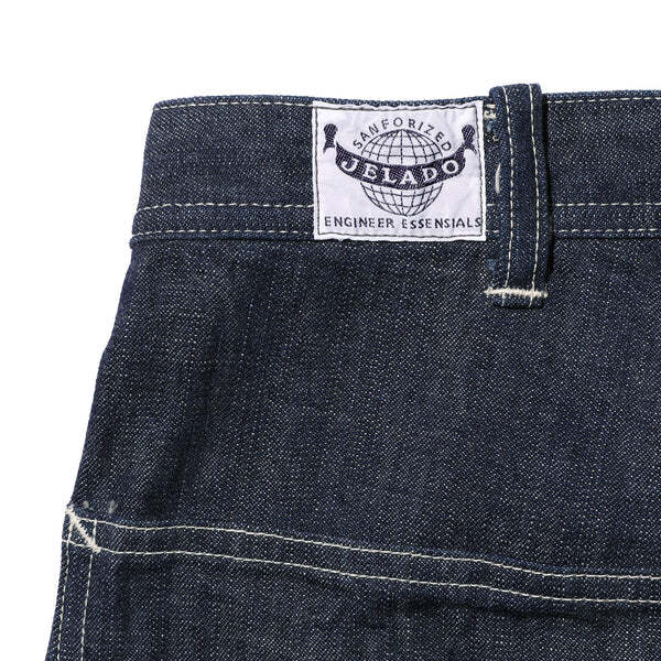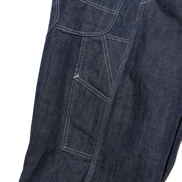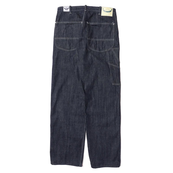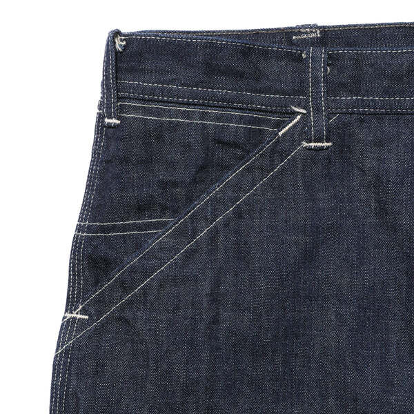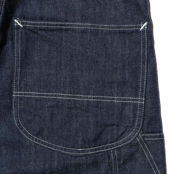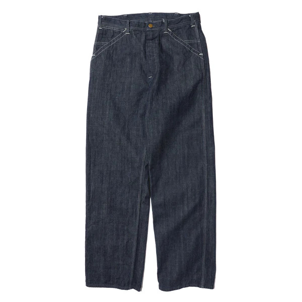 このデニムは40年代のLEEのカバーオールを解体し、糸の分析を行い、ヴィンテージの色落ちなどの特徴を研究しました。その結果、同様のタテ落ち感を持つデニムを制作しました。この生地を使用して、40年代のハウスマークのペインターパンツを再現しました。