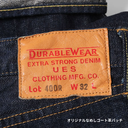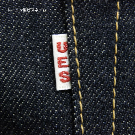 素材となる生地はUESオリジナルの14.9oz茶綿デニム。紡績時に茶綿をブレンドした別注の糸はロープ染色すると、レギュラー糸に比べ重厚感のある濃い色に染まります。このオリジナルの弱撚糸を旧式の力織機で時間をかけて織るため、色落ちに定評のある生地を作ることができました。